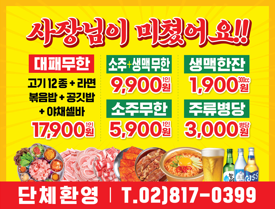 🐷엉터리 무한대패 (1인)🐷 17,900 | 🍶무한소주 (1인)🍶 5,900 | 👶무한대패 (5~7세)👶 7,000 | 🧒무한대패 (8~10세)🧒 10,000 | 🍶🍺소주+생맥 무한(1인)🍶🍺 9,900 | 🍺생맥 300cc🍺 1,900 | 🍜살얼음 냉면 (물/비빔)🍜 5,000 | 🍲된장술밥🍲 6,000 | 🍲된장찌개🍲 5,000 | 🥘폭탄계란찜🥘 4,000 | 🍲김치찌개🍲 5,000 | 🍹음료🍹 2,000