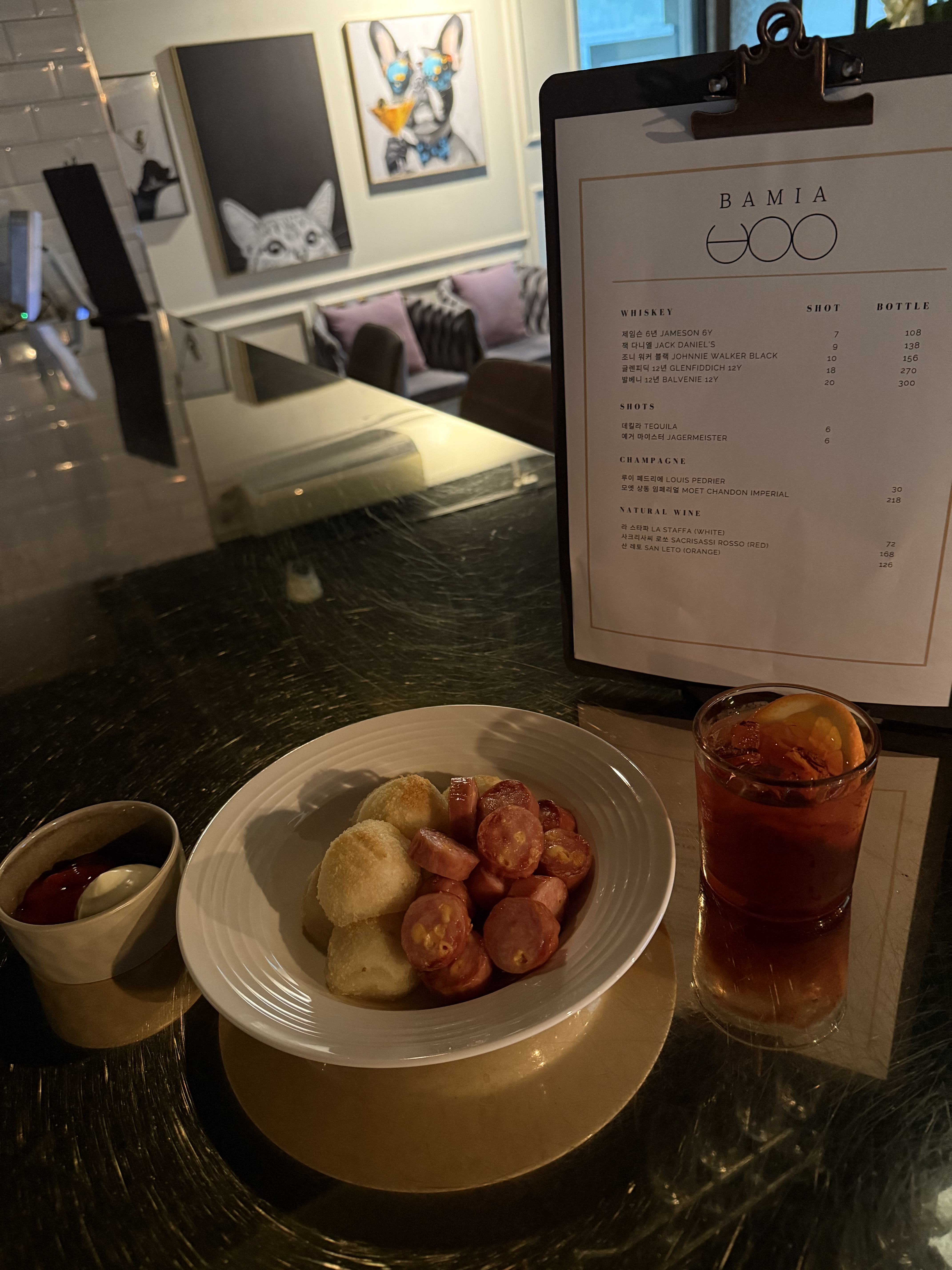 시금치 아티초크 딥 12,000 | 새우와 꼬막 세비체 12,000 | Frozen cocktail 17,000 | 감자 밀푀이 15,000 | 소세지 & 치즈볼 18,500 | 칠리치즈 프라이 18,000 | 육포 15,000 | 호가든 7,000 | 아사히 9,000 | 코로나 9,000 | 산미구엘 9,000 | 하이네켄 10,000 | 네그로니 13,000 | 코스모폴리탄 12,000 | 피치크러쉬 11,000 | 미도리 사워 11,000 | 코카콜라 2,000 | 진저에일 4,000 | 토닉 4,000 | 산 펠레그리노 8,000 | 제임슨 6년 108,000 | 잭 다니엘 138,000 | 조니 워커 블랙 156,000 | 글렌피딕 12년 270,000 | 발베니 12년 300,000 | 데킬라 샷 6,000 | 예거 샷 6,000 | 루이 페드리에 30,000 | 모엣 샹동 임페리얼 218,000 | 라 스타파 72,000 | 샤크리사씨 로쏘 (레드) 168,000 | 산 레토 126,000