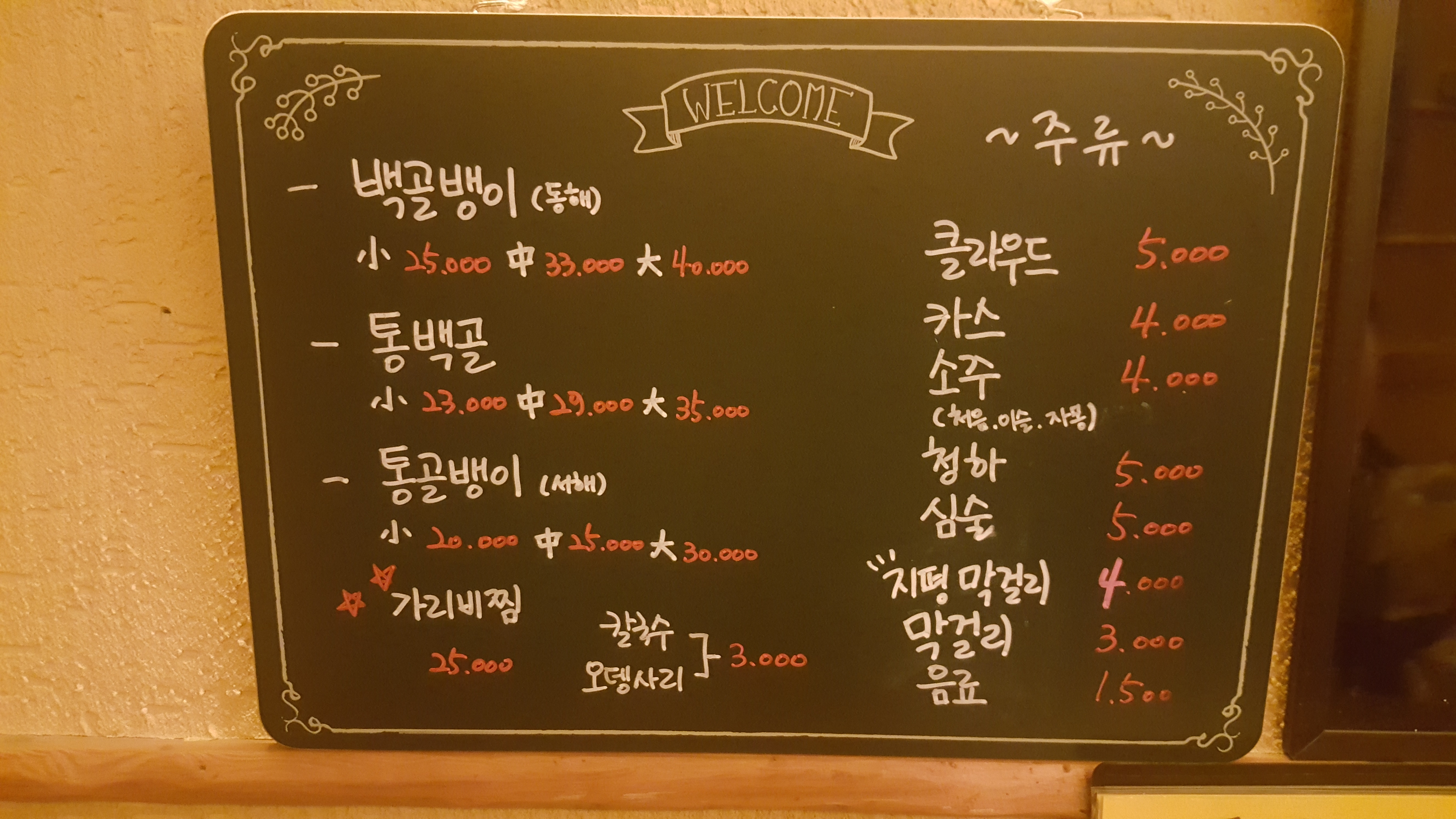 두부김치 15,000 | 무뼈닭발 17,000 | 어묵탕 15,000 | 백합탕 15,000 | 햄치즈크래커 25,000 | 알쌈쭈꾸미 14,000 | 쭈삼 15,000 | 백골뱅이 소 35,000 | 점심특선(쭈꾸미정식) 9,000 | 백골뱅이 중 47,000 | 백골뱅이 대 60,000 | 통백골(반반) 소 28,000 | 통백골(반반) 중 38,000 | 통백골(반반) 대 48,000 | 통골뱅이 소 23,000 | 통골뱅이 중 29,000 | 통골뱅이 대 35,000 | 문어숙회 29,000 | 칼국수/오뎅 사리 3,000
