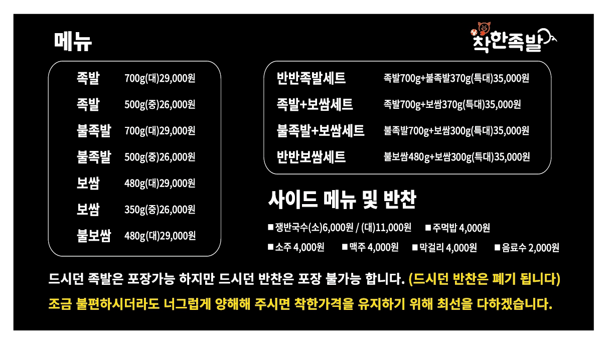 족발 700g(대) 29,000 | 족발 500g(중) 26,000 | 불족발 700g(대) 29,000 | 불족발 500g(중) 26,000 | 반반족발세트(특대) 35,000 | 불족발+보쌈세트(특대) 35,000 | 족발+보쌈세트(특대) 35,000 | 보쌈 480g(대) 29,000 | 보쌈 350g(중) 26,000 | 쟁반국수(소) 6,000 | 쟁반국수(대) 11,000 | 주먹밥 4,000