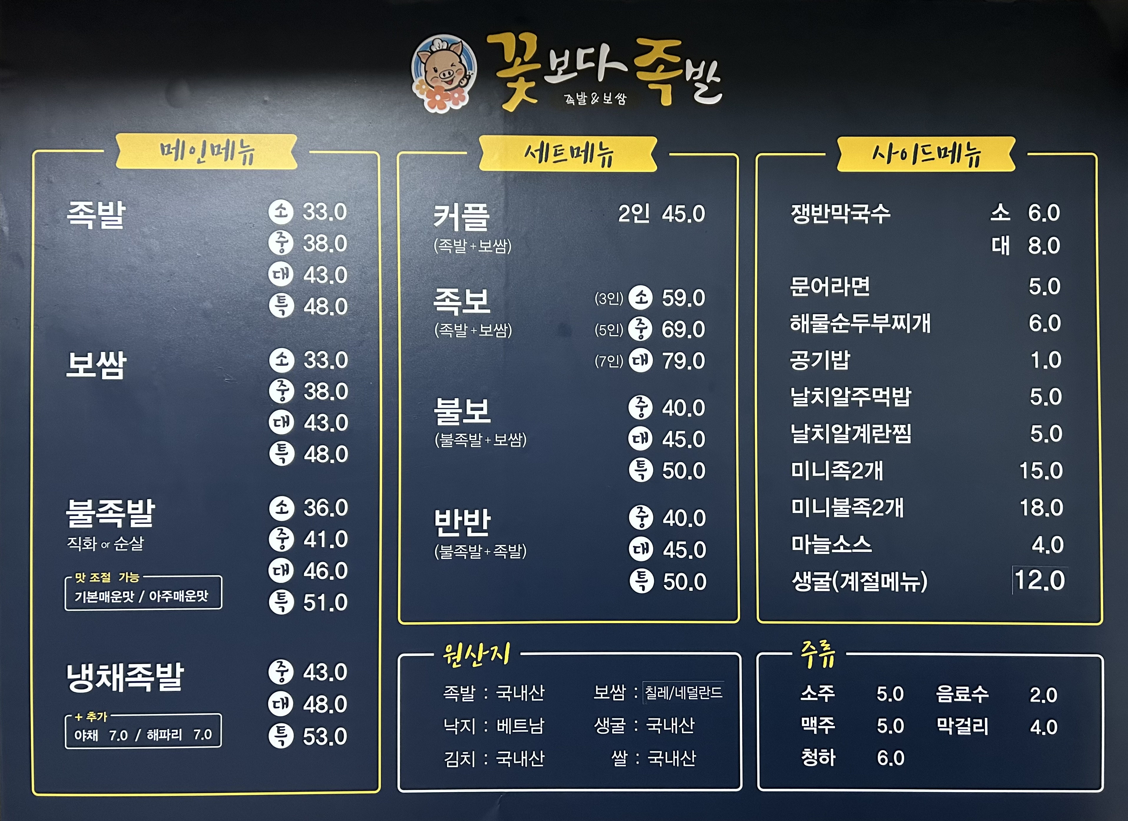 족발 소 33,000 | 족발 중 38,000 | 족발 대 43,000 | 족발 특 48,000 | 보쌈 소 33,000