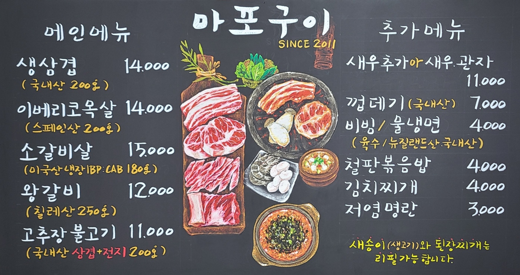 생 가브리살 15,000 | 생삼겹 15,000 | 왕갈비 13,000 | 고추장불고기 11,000 | 이베리코목살 15,000 | 소갈비살 16,000 | 새우추가 or 새우관자 11,000 | 껍데기 7,000 | 비빔/물냉면 5,000 | 철판볶음밥 4,000 | 김치찌개 4,000