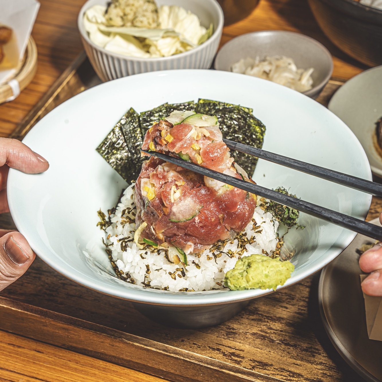 “”숙성된 연어가 선사하는 사케동의 풍미””