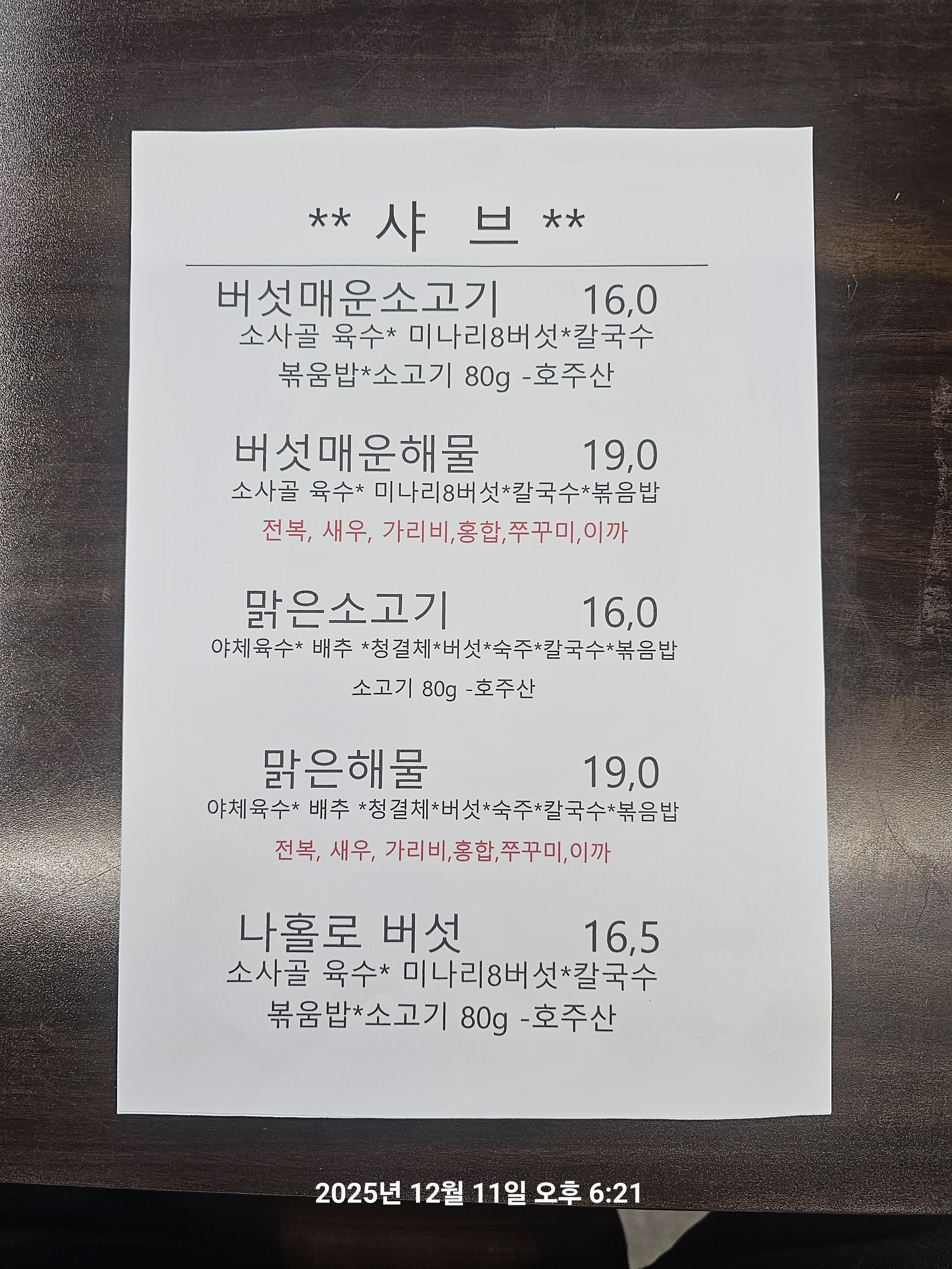 샤브고기 200g 10,000 | 얼큰2인SET (샤브고기 포함) 30,000 | 맑은2인SET (샤브고기 포함) 30,000 | 얼큰/맑은3인SET (샤브고기 포함) 40,000 | 얼큰/맑은4인 고기한판SET 50,000 | 얼큰/맑은4인 고기두판SET 59,000 | 얼큰/맑은버섯칼국수 11,000 | 야채추가 4,000 | 면사리 2,000
