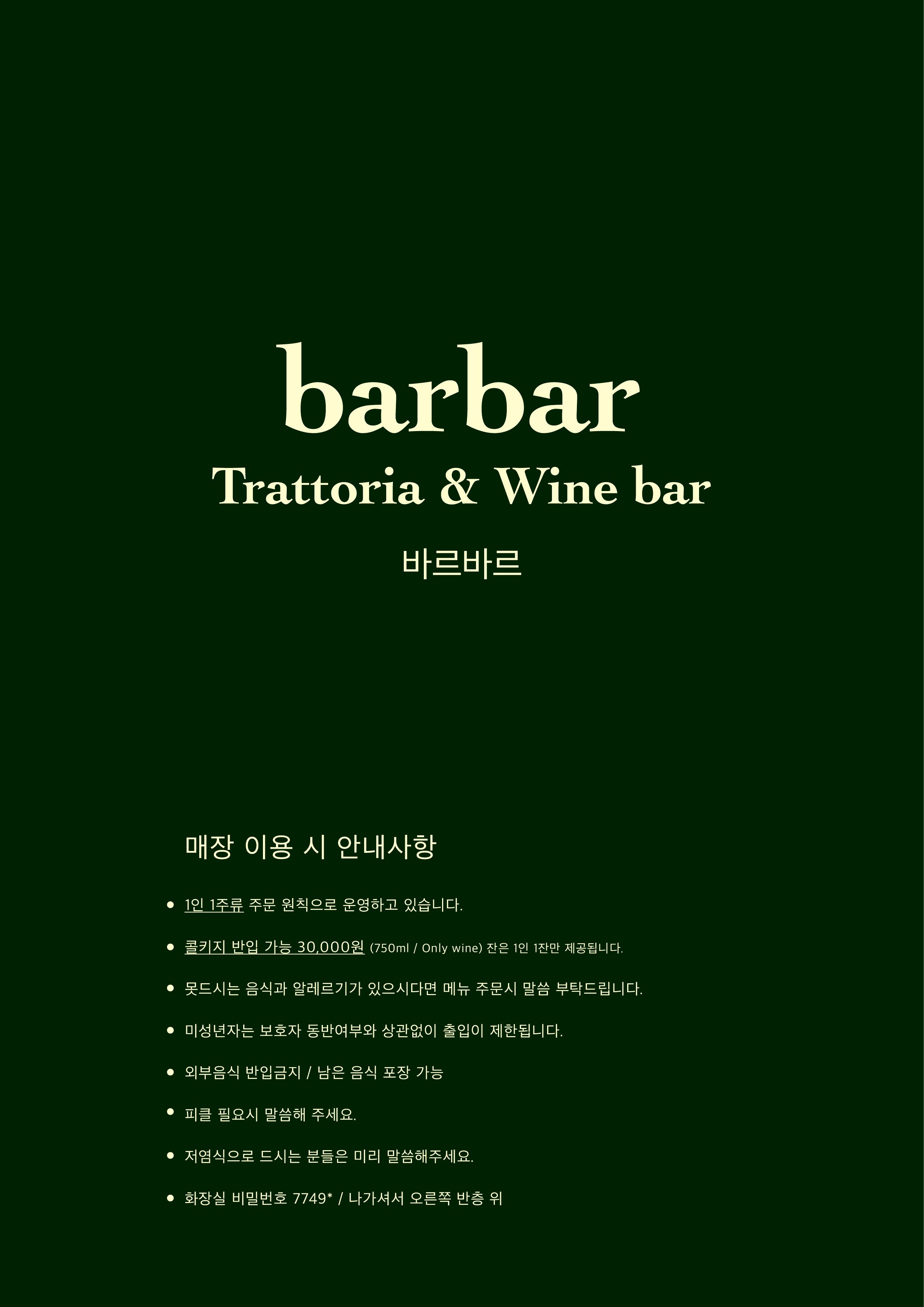대구살 아란치니레몬크림소스,샬롯 23,000 | 비프 타르타르한우, 아보카도 27,000 | 뽈뽀문어,바질크림소스,포카치아 27,000 | 채끝 스테이크 350g 내외 54,000 | 클래식뽀모도로토마토소스,프레시바질 16,000 | 클래식 까르보나라 관찰레,페코리노 18,000 | 푸타네스카 엔쵸비,올리브,케이퍼 19,000 | 베로네제단새우회,알리오올리오,크림 19,000 | 트러플 봉골레 트러플소스,모시조개 20,000 | 부라타치즈 샐러드 15,000 | 치즈플레터 치즈,샤퀴테리,크래커 20,000 | 브라우니 플레터 10,000