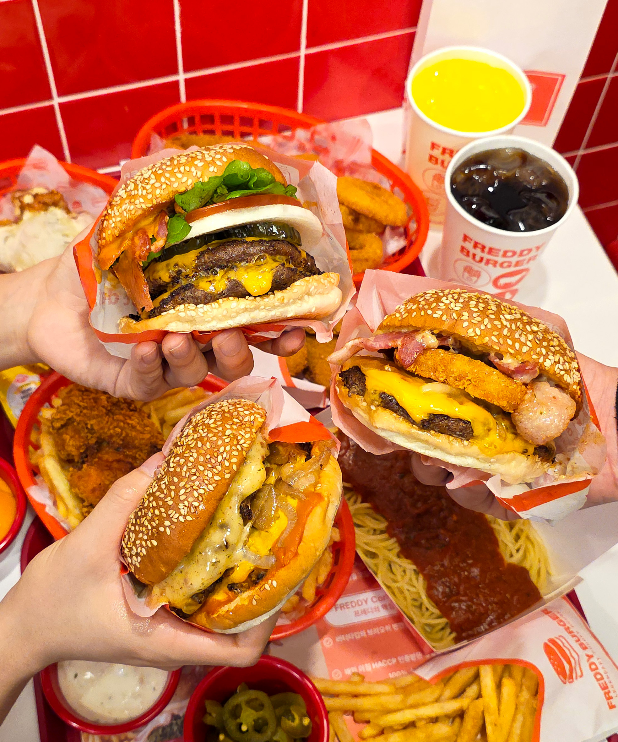 치즈버거 8,600 | 베이컨치즈버거 9,600 | 더블치즈버거 13,400 | 더블베이컨버거 15,400 | 크림버거 9,400 | 더블크림버거 15,200 | 어니언링버거 10,600 | 루콜라버거 10,800 | 아보카도버거 11,200 | 해쉬브라운버거 10,600 | 에그오믈렛버거 11,000 | 오리지널후라이즈 5,000 | 케이준후라이즈 5,000 | 치즈후라이즈 6,400 | 셀럽후라이즈 6,800 | 갈릭파마산후라이즈 7,400 | 부리토후라이즈 7,400 | 바베큐치폴레후라이즈 7,400 | 피넛버터콘후라이즈 7,400 | 칠리치즈후라이즈 7,900 | 어니언링 7,200 | 스위트포테이토후라이즈 7,400 | 코카콜라 3,000 | 코카콜라제로 3,000 | 스프라이트 3,000 | 스프라이트제로 3,000 | 닥터페퍼 3,000 | 마운틴듀 3,000 | 환타오렌지 3,000 | 환타파인애플 3,000 | 웰치스포도 3,000 | 스내플 피치 4,400 | 스내플 키위스트로베리 4,400 | 스내플 망고 4,400 | 스내플 애플 4,400 | 맥파이라거 8,000
