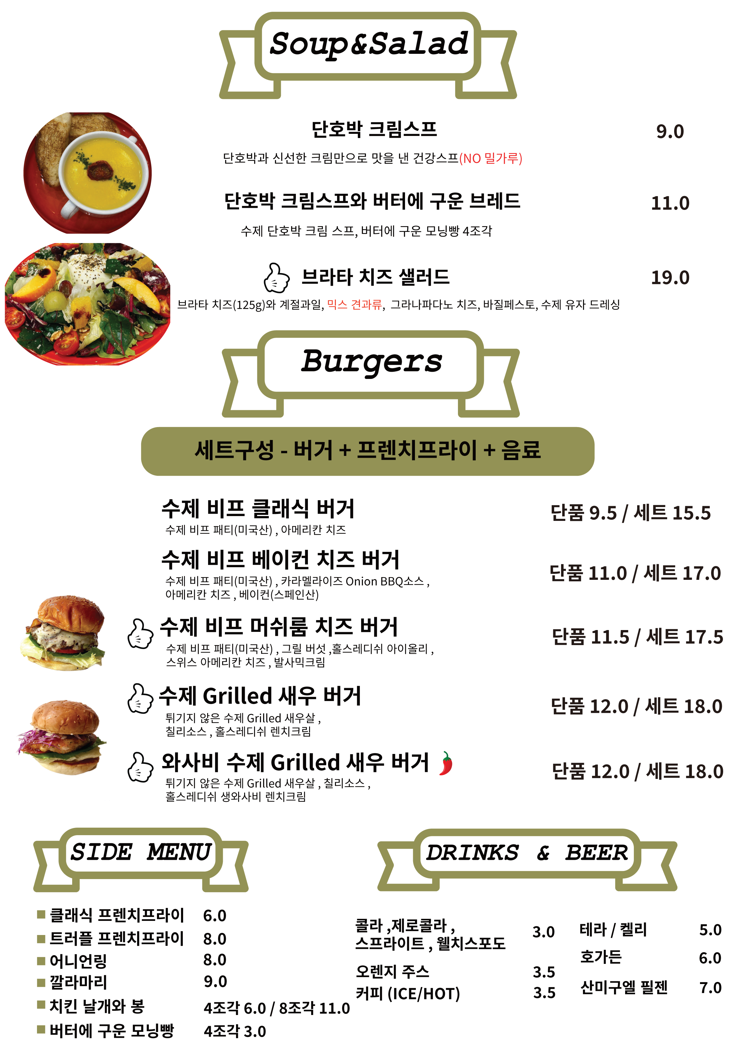 🍂트러플치즈버거 6,500 | 🍂더블트러플치즈버거 9,400 | 🍂트러플베이컨해쉬버거 8,500 | NEW🍂) 해쉬브라운 2,300 | NEW🍂) 새우링 3,900 | 프레쉬버거 4,900 | 버거리버거 6,900 | 소불고기버거 5,200 | 쉬림프버거 5,800 | 클래식치즈버거 6,100 | 더블클래식치즈버거 8,900 | 할라피뇨치즈버거🔥 6,900 | 할라피뇨더블치즈버거🔥 9,900 | 통모짜치즈버거 8,500 | 에그불고기버거 6,300 | 에그베이컨버거 7,900 | 하와이안버거 7,300 | 핫치폴레버거🔥🔥 7,300 | 비프앤쉬림프버거 8,700 | 클래식치킨버거 6,400 | 크리스피치킨버거 6,700 | 프렌치프라이(L) 2,700 | 양념감자(멕시칸칠리) 3,200 | 양념감자(사워크림어니언) 3,200 | 치즈스틱 2,700 | 츄러스 3,500 | 어니언링 3,500 | 버팔로윙&스틱 5,200 | 크리스피치킨텐더 3,000 | 치킨너겟 3,000 | 양념너겟(멕시칸칠리) 3,500 | 양념너겟(사워크림어니언) 3,500 | 콘샐러드 2,500 | 코울슬로 2,500