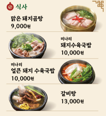 샤브국밥 9,000 | 고추장제육덮밥 9,000 | 얼큰국밥 10,000 | 모듬국밥 10,000 | 순대국밥 9,500