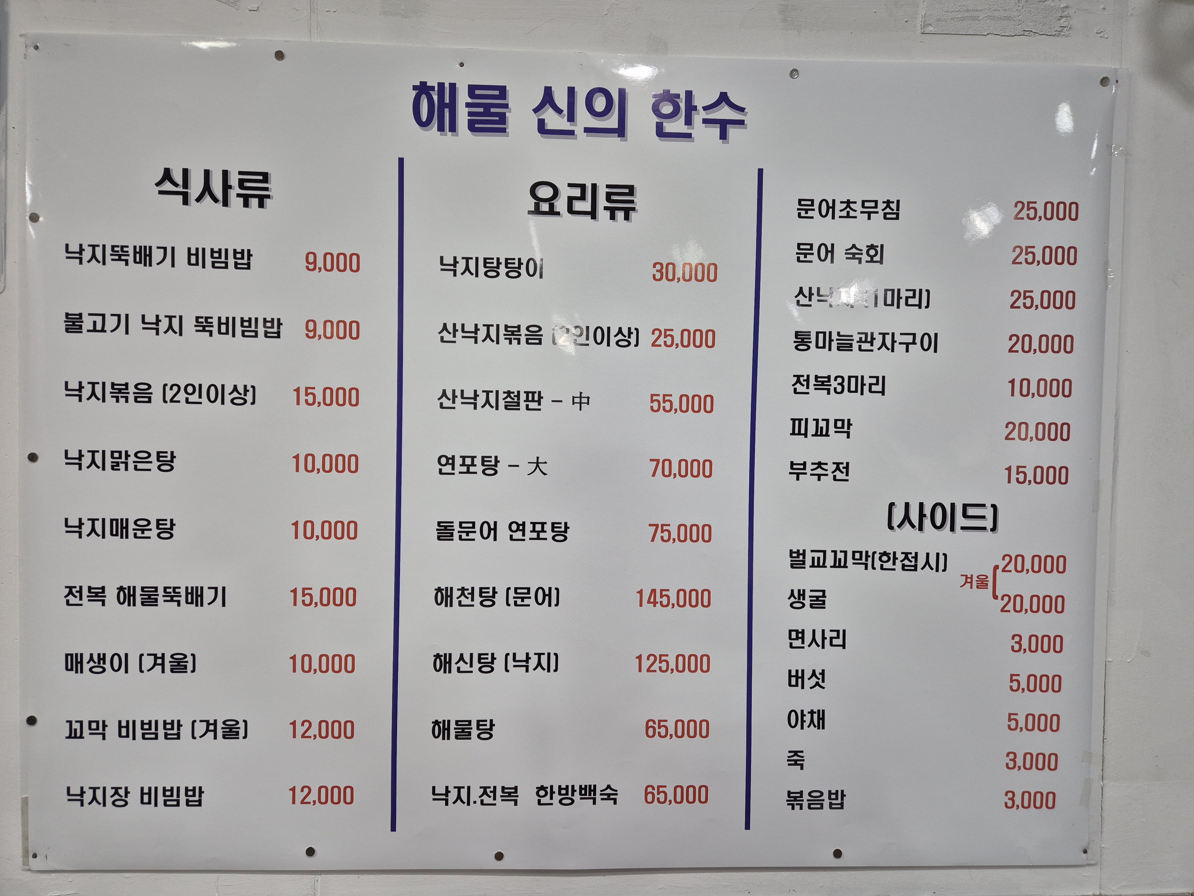 낙지맑은탕 10,000 | 해천탕 139,000 | 산낙지철판(중) 50,000 | 산쭈꾸미볶음 20,000 | 해물탕(대) 65,000 | 해신탕) 119,000 | 낙지볶음 15,000 | 꼬막비빔밥 10,000 | 낙지맑은탕 10,000 | 매생이굴탕 10,000 | 낙지비빔밥 9,000 | 통문어연포탕 70,000 | 전복해물뚝배기 15,000