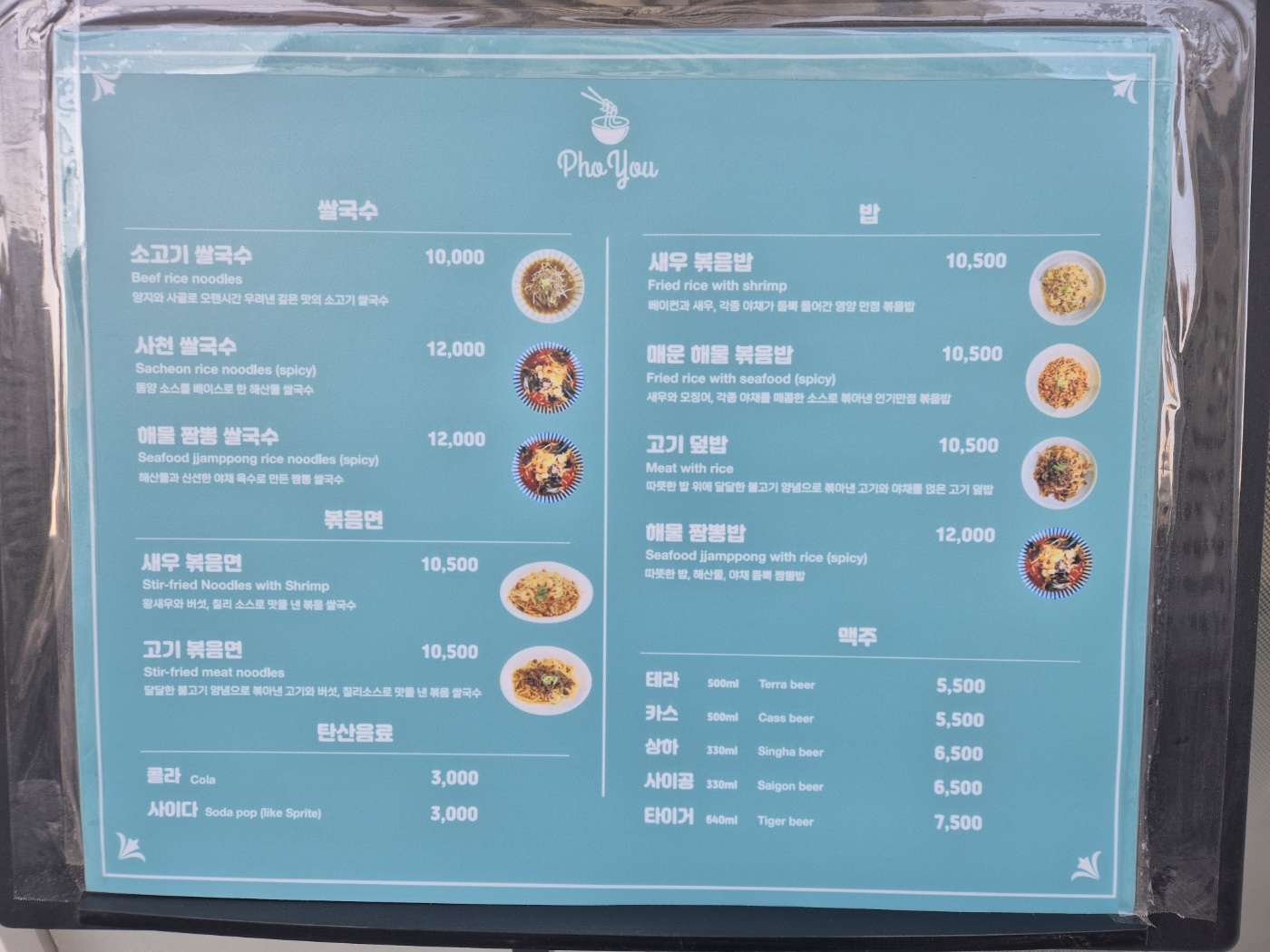 해물짬뽕쌀국수 12,000 | 소고기 쌀국수 10,000 | 사천 쌀국수 12,000 | 새우 볶음밥 10,500 | 매운 해물 볶음밥 10,500 | 새우볶음면 10,500 | 고기볶음면 10,500 | 고기덮밥 10,500